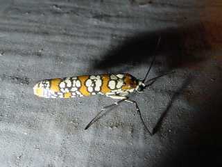 * Ailanthus Webworm Moth * I keep finding these things all around my light at my front door. It almost looks as if somebody hand painted the markings on them. No, no, trust me, I didn't do it.