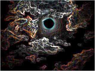 From a previous image of the clouds and the moon and made some simple adjustments. An "edge" effect cuts most of the image apart, just leaving the dominant edges from the image. This can sometimes give very interesting results.