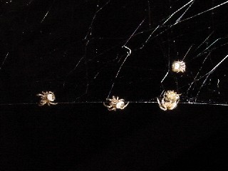 Now, to put this image into perspective, the total size of this image was about a quarter of an inch wide. Almost walking through this web, at my back door, I noticed hundreds of tiny specs all over it. Obviously, a little closer inspection revealed the specs to be hundreds of tiny spiders, just recently hatched. Not finding the mother, I assumed that they had eaten her shortly after they emerged. Then, as they grew larger, like the one on the right, they appeared to be eating each other.