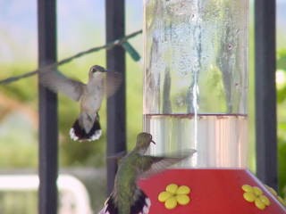 As I took picture after picture of the hummingbirds, of course most of them didn't turn out so well. But I have gotten quite a few good shots of them. Unfortunately I'm still attempting to get a good shot of one right over my head, looking directly at me. They sometimes do the strangest things though. As I'm trying to get their picture they will often buzz all around and suddenly I can hear one of them no more than a foot from the back of my head. But, of course, as I turn around, they zip off. And I can almost hear them laughing and giggling at me. But it is fascinating to see how the interact with people. Watching my aunt refill the feeder is actually quite humorous as the birds appear to be impatient and seem to be stalking her until she gets it back together and hung up.