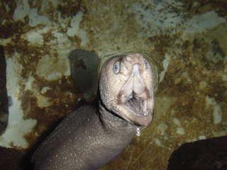 This moray eel was in a tank at an aquarium in Puerto Penasco. It was swimming around at the top of the water, occasionally sticking its head up, several inches out of the water. Now, getting your hands anywhere near this thing's mouth would certainly result in a quick and serious injury. Although not seen in this shot, they do have some incredibly sharp teeth hidden in there.