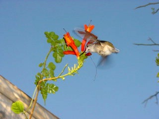 I was on my front porch yesterday and heard that strange buzzing noise off to the side and noticed a hummingbird zipping around a bush, darting back and froth from flower to flower. I quickly grabbed my camera and the chase was on. The hummingbird wasn't eluding me, but merely going about its business. But it quite the difficult endeavor to catch these things. As soon as I would just about get a good shot, it was off to another flower. Every once in a while I would loose track of the thing, but then would follow the sound and find it again. Then, as I was next to the bush I followed it up and right above my head.