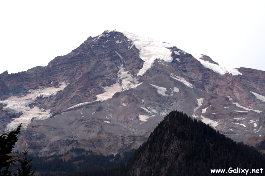 While driving up to see Mt. Rainier we were a bit concerned since the forecast had called for rain that weekend. Yeah, can you believe it? "Rain, in Washington?" But we were quite pleased because the skies cleared up as we got closer to the mountain, and although we didn't have the most sunny day, it was still nice, there was no rain, and we got lots of pictures of the mountain. Like this one where the highway actually runs right up along side the base of the mountain. Actually this shot was taken a little further up the road where it winds around to some good view points. But this mountain is quite fascinating when you stand there and look right at it.