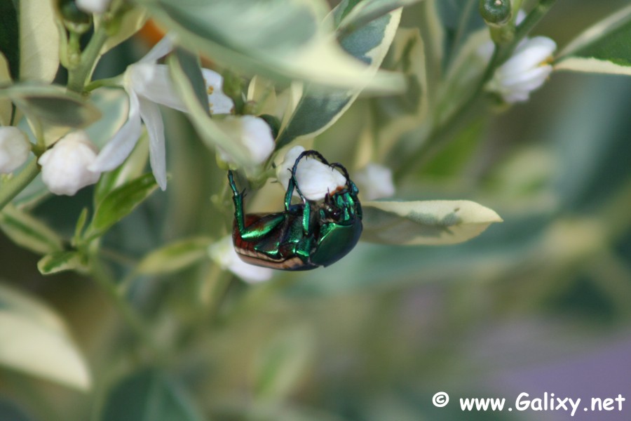 Here you get a little "two-for-one" deal for today. A shiny green beetle on a citrus blossom.