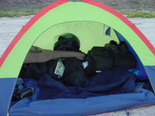 Many people have asked how I can get all my stuff in my tent and still have enough room for myself. So here's a picture of the inside of the tent and all my gear. There, right at the opening is my sleeping bag.
