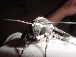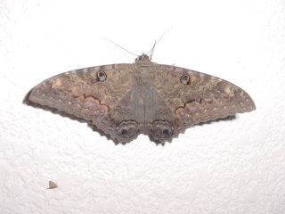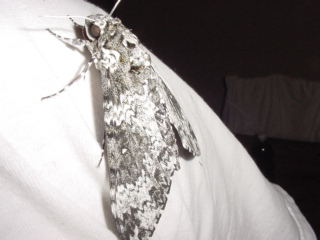 Then this large moth made its way inside and bounced off of the ceiling fan. It was quite rattled for a while but soon recovered before I kicked it back outside. Then another large moth came flying in and looked like a bat. This one had a wingspan of about five inches.