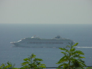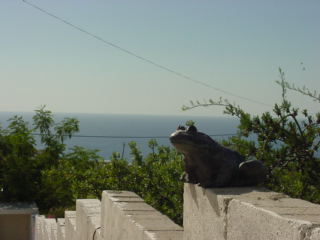 The next day the frog came out to get some sun on the wall overlooking the ocean as a cruise ship passes by.