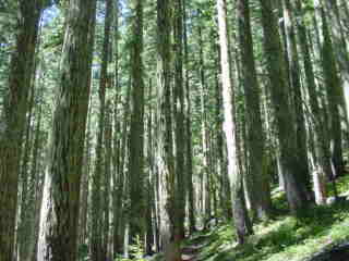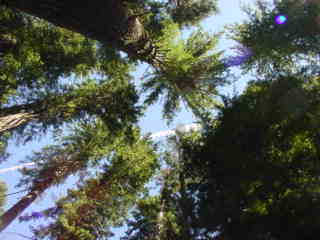 Further up the trail I find myself surrounded by enormous trees. Looking up I get the vertigo feeling as a vapor trail moves along by the upper winds giving the eerie feeling that the forest is moving. I move on further where I find an area of trees covered in moss. Its a good thing that I knew where I was because the moss grows on all sides of the trees. Of course I never have adhered to that theory that moss only grows on the north side of the tree. I think that all depends on the location and climate. In the northern hemisphere moss may often grow on the north side due to the fact that the sun would be shining upon the south side's of the trees, leaving the north side remaining cool and moist more often.