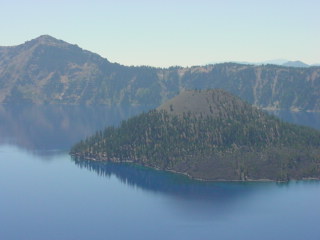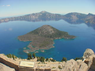 More pictures here show Wizard Island at different angles. Even with my wide angle lens I couldn't get the whole scene in one shot. However, I did use my panoramic software to stitch a bunch of images together. You can view those in the Panoramic section of my web site. Here's a few shots partially stitched together.