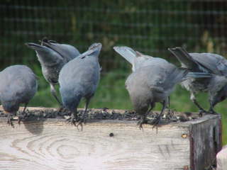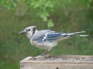 Camp robbers, as my aunt called them, these blue birds had a strange way of shelling and eating the sunflower seeds. They would pick them up, place the seed in between their feet and crack them open with their beaks, which made for an interesting view with all the birds nose down to their feet.
