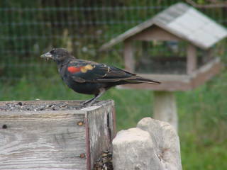 Back at my Aunt's house I was enthralled by all the variety of wildlife that enjoyed her bird feeder. I'm sure, although it was probably more a fight for survival, it appeared as though all the animals took turns with the food. Once I would look out and the Grosbeaks were eating away when I'd look out and notice a squirrel or two had taken over the porch. Then the occasional sparrow here and there, a few odd-looking red-winged black birds like the next one and a blue-jay or two.