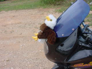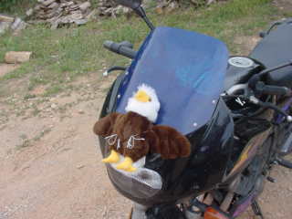 I picked up this little stuffed, bald eagle at the gift shop at Devil's Tower. I decided that he'd make the perfect travel companion so I strapped him to the front of the bike for the ride. I may occasionally take him back of from time to time for bad weather or for a good cleaning here and there.