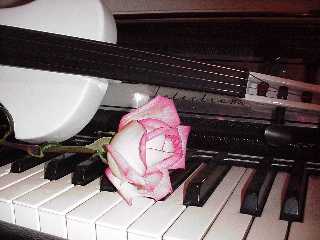 A little different twist on the typical (still-art) "piano, violin, red rose" pictures, this is actually an electric piano, an electric violin, and the rose is not red.