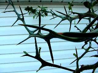 These tough green thorns were on a small tree bearing some weird shriveled up peach looking things on it.