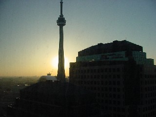 At a height of 1,815 ft. 5 in. the CN Tower in Toronto is the tallest building and free-standing structure in the world. In the larger image you can see the open roof of the Sky Dome at the base of the tower.