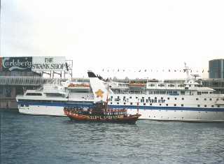 I thought this was an interesting picture. I took this at the Hong Kong harbor. There's an old fishing boat there in front of a somewhat large cruise ship. That's very much like the highways there in Hong Kong. You will see some real nice and fancy Mercedes right there beside somebody on a little beat-up three-wheeler or even some strange un-identifiable vehicle.