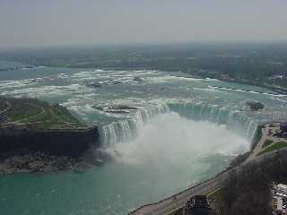 This is a shot from the Skylon Tower in Canada. This is the Canadian Niagara Falls. That is Canada in the lower right part of the image and Goat Island (USA) on the left.