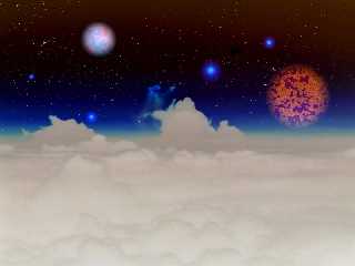 The original image was an actual picture from the window of an airliner, right after sunset. The sky was bright with a touch of orange and the clouds were very dark. I reversed the image (negative) which, of course, caused the sky to be dark, with blue, and the clouds to come out bright. I then overlaid the stars in the background and added planets that I had previously created.