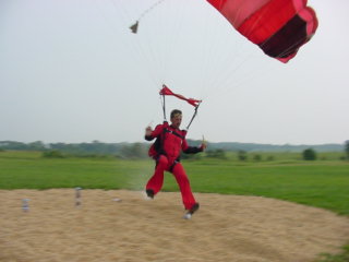 This is a shot of my friend, Mike French. Swooping the landing area on the last load of the day, Mike here shows his skills by kicking a can of beer.