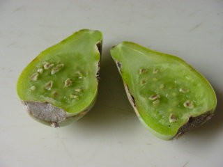 This really surprised me when I cut open a cactus fruit. Although there are various types of different cactus fruit, this particular one here comes from what they call a cholla cactus. The inside is actually quite good, tasting a little bit like a kiwi fruit. Unfortunately, they are quite small, only about an inch or two in diameter, and have very tiny hair-like bristles on the surface that are very uncomfortable when they make contact with the skin. They are so tiny that they are not easy to see, but you certainly feel the sharp sting after they get imbedded into your skin.