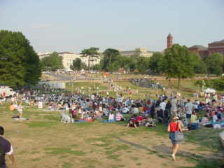 Several years ago I had the opportunity to witness this somewhat humorous event. It was July 4th, 2002 in Washington D.C. While enjoying the entertainment of the festival atmosphere, and waiting out the heat of the day for the firework's display, later that evening, this crowd of people was enjoying a nice relaxing afternoon in the shade. Unfortunately this shadow was cast down from the Washington Monument. As the day progressed, the shadow moved across the ground much like a giant sundial. So, in an attempt to keep cool, this crowd of people, very slowly and gradually scooted across the ground, chasing the shade.