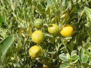 This little tree is one that my Aunt and Uncle had planted some years ago. They weren't sure exactly what type it was as the tag was just marked, "Citrus Tree". The tree itself is only about five feet tall and, as you can see, it does actually produce fruit. A tiny orange-like fruit at about one inch in diameter. They taste like a cross between a lemon and an orange and have a very thin skin. Rather than take the time to peel them I just pop them in my mouth just like they are. They are quite tasty but also very sour.