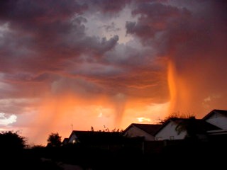 As I looked around one day I notice the color in the room had a very interesting hue. I went to the window and looked out to see this incredible sight. As the sun was setting it was shining these amazing colors off of the clouds as they were raining in isolated places. The sweeping motion of the rain clouds almost looked like brightly colored tornados.