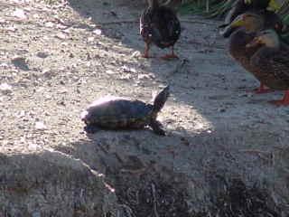 Here's another critter from the Aqua Caliente Park, here in Tucson. This Sonoran Mud Turtle, pictures here, seemed to be having reservations about the ducks trespassing on his island. The turtles can easily be seen swimming all around the waters of the park, although they most often remain buried in the mud at the bottom of the ponds.