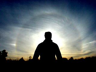 As I was riding the other day I noticed that the sun was presenting some of those "Sun Dogs" as I have heard them referred to as. The bright rainbow-like prisms that you can often see on each side of the sun. But as I rode further I watched as the light cloud coverage had presented me with an awesome view. So I got out the camera and tripod and took several shots. This image is slightly enhanced to bring out the contrast of the shot. I decided to stand in front of the camera and block the sun to obscure the glare.