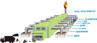 Here's a small sample of a new graphic image that I just put together for the Mr. Fusion Project. It displays a process of municipal waste entering the front end of a factory, with various products being output on the sides. But with the humorous twist of it resembling a bug eating garbage.