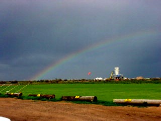 While in Eloy, at Skydive Arizona this past weekend, a thunderstorm blew through and literally put a damper on the day's activities. But during the storm I looked out and across the alternate landing area, towards the construction site of the new wind tunnel, I noticed a rainbow and got this shot.