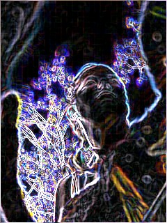 This original image was taken of a girl in the reflection of a small pool of water. The angle and all the surrounding artifacts made for an interesting shot. Then performing an "edge" and negative effect and a little color enhancement, and I have an rather abstract creation.