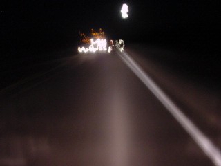 A very bad and abstract picture, I took this shot, playing around with the slow shutter speed, while I was bored and riding at night. The oncoming trucks on a two lane highway are very menacing at night. That's actually the moon at the top of the image.