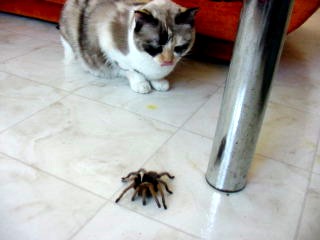 I thought that a cat's normal reaction is to stalk and attack any living creature that flutters or scurries across the ground. But apparently they are not quite as dumb as I had originally presumed. Samantha didn't quite know what to think of the tarantula. Especially after the first contact when the tarantula raised its front legs in an attack pose. After that Samantha just curiously observed the fuzzy arachnid from a safe distance.