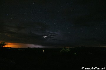 While I was chasing a storm the other night I pulled off the main road to see if I could get a good shot of it from a distance. This is one of the actual shots I captured. With a little assistance with the open shutter I was able to get a glow from Phoenix on the left side of the image, light on the trees from passing cars, an airplane zipping across the sky, the stars, and the thunderstorm. But again, if you look carefully you can see that some of the stars are not quite in focus. Since I was facing north, some of the stars further towards the outside of the image are slightly blurred from the rotation of the earth. Still waiting for a good clear night, I do plan to get this motion captured in a good clean shot.