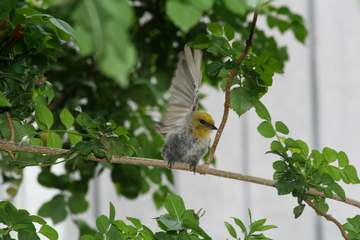 I caught this little bird right at the moment that it was taking off. It's crouched down and it's wings are spread out and ready for lift off.