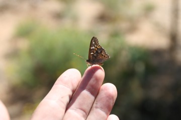 I always love getting close to nature and be able to interact in various degrees. And as I was walking around the property I saw this butterfly fluttering about in the sunlight. It circled me a few times so I held out my hand, and it landed on the palm of my hand. Before I could get the camera up and ready, it took off. But it stayed in the general vicinity where I took numerous pictures of it, including several of these where it decided to land on my hand again.